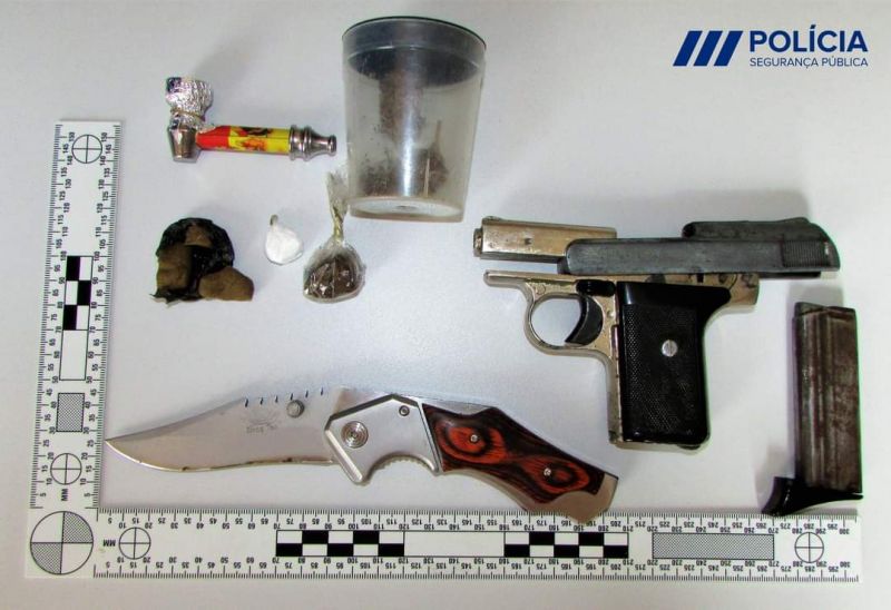 Foi-lhe apreendida uma pistola, calibre 6.35mm, sem marca, uma navalha de marca Xiong Tao, com 9 cm de lâmina, cerca de 12 doses individu...